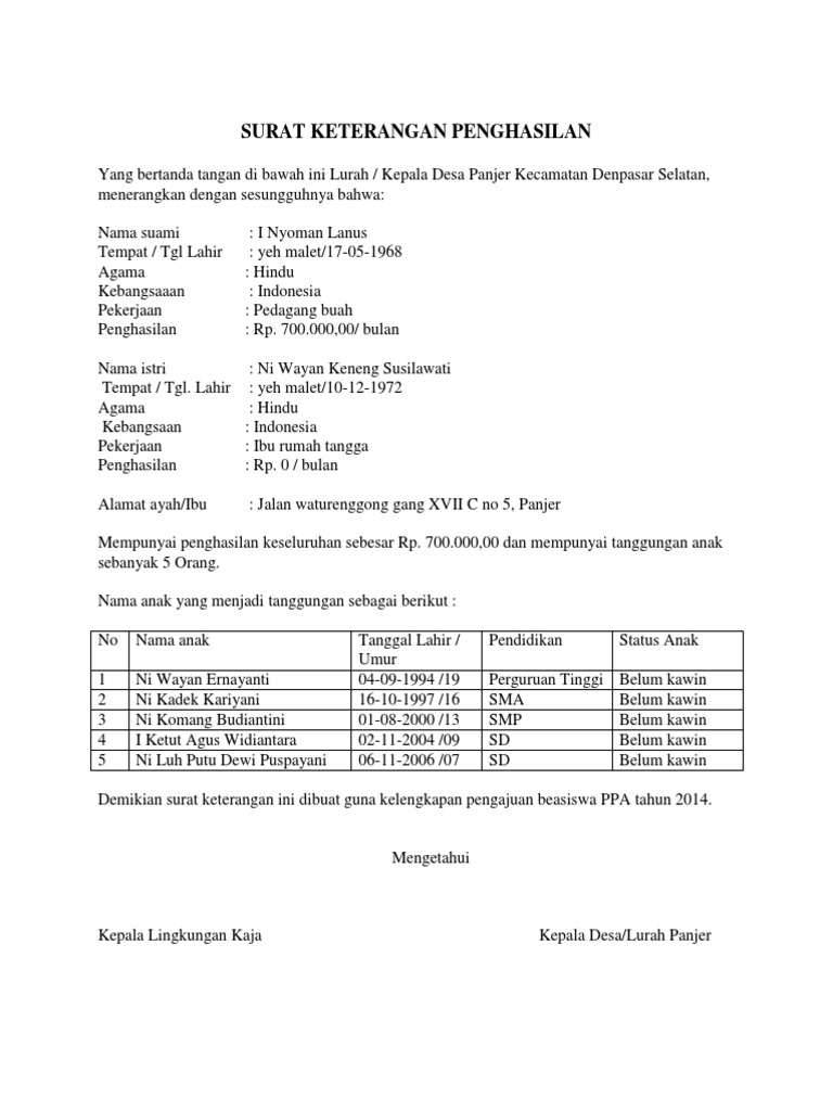 Yang bertanda tangan di bawah ini : Surat keterangan penghasilan orang tua. Misalnya wiraswasta, pedangan, petani, pns, tni, dll. 3.000.000 ( tiga juta rupiah ) surat keterangan ini dimaksudkan untuk diberikan kepada pihak yang berwenang di sma widya mandala guna melengkapi persyaratan administrasi permohonan beasiswa bagi : Surat keterangan merupakan salah satu jenis surat yang paling sering di buat karena isi surat keterangan umumnya menyangkut aktivitas manusia. Dalam surat keterangan penghasilan orang tua juga biasanya menjelaskan biaya. Ada surat penghasilan orang tua untuk beasiswa, dari pihak kepala desa, rt dan lain sebagainya. Contoh surat keterangan penghasilan orang tua. Cara membuat kop surat resmi. Semoga surat keterangan ini dapat dipergunakan sebagaimana mestinya. Contoh keterangan penghasilan orang tua untuk beasiswa ppa. Contoh surat keterangan penghasilan untuk kredit leasing. Download contoh surat keterangan penghasilan orang tua format word surat penghasilan biasanya digunakan untuk berbagai keperluan finansial seperti pengajuan.