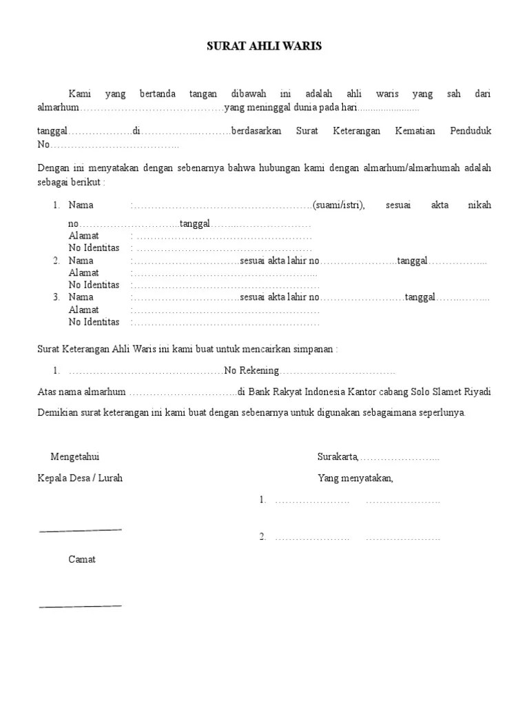 Oleh karena itu, bagi anda yang belum mempunyai surat ini untuk segera bisa mengurusnya ke pihak yang berwenang. Contoh pengajuan pembatalan haji dan penarikan saldo tabungan hajifull description. Format surat keterangan ahli waris tanah. Bagaimana cara mengurus surat keterangan untuk ahli waris pribumi? Surat pernyataan pembagian waris 3ang bertanda tangan / 4ap 5empol dibawah ini kami para ahli waris dari almarhum.