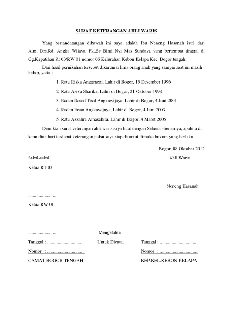Tanpa adanya surat ini, seseorang yang dianggap ahli waris tidak bisa mengambil dan menguasai harta warisan peninggalan pewaris, walaupun memang. Atau boleh dikatan bahwa surat yang diberikan oleh pemilik warisan kepada ahli waris. Oleh karena itu, bagi anda yang belum mempunyai surat ini untuk segera bisa mengurusnya ke pihak yang berwenang. Pembagian harta warisan masih menjadi hal yang sensitif di oleh sebab itu, perlu adanya surat keterangan yang menyatakan bahwa kamu memang merupakan ahli waris sah. #1 perhatikan dokumen prasyarat yang digunakan untuk registrasi skhw di kantor kelurahan. Surat keterangan waris ini ada yang dibuat secara bawah tangan dan ada juga yang dibuat di hadapan pejabat yang berwenang. Surat pernyataan pembagian waris 3ang bertanda tangan / 4ap 5empol dibawah ini kami para ahli waris dari almarhum. Surat ahli waris inilah yang menjadi surat kuasa bagi orang yang sudah meninggal dunia. Keberadaan surat keterangan ahli waris atau skw merupakan hal yang penting, apalagi bagi mereka yang memiliki harta peninggalan berupa rumah, apartemen ataupun tanah. Skw memiliki fungsi memperkuat bukti bahwa seseorang berhak disebut pewaris dari orangtuanya yang. Format surat keterangan ahli waris tanah. Surat keterangan ini sekilas hampir mirip dengan surat pernyataan , namun sejatinya ke dua surat tersebut adalah surat yang berbeda. Ini dibutuhkan saat menyelesaikan persoalan yang sifatnya administratif, tetapi memiliki kekuatan hukum.