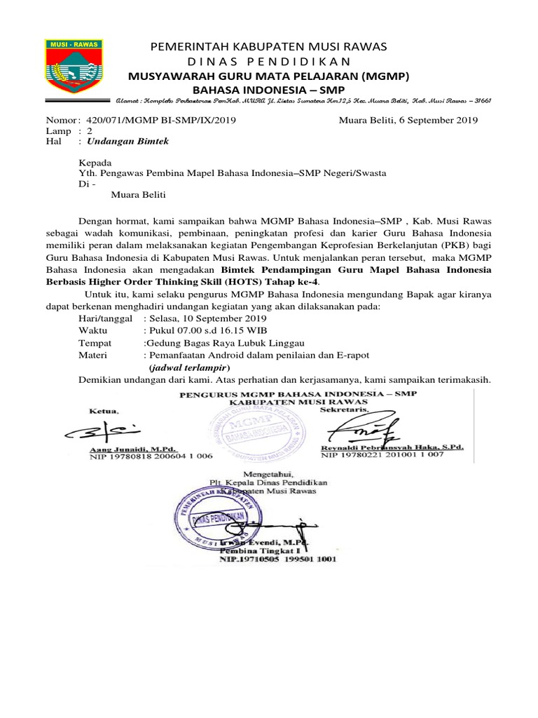 Contoh Surat Undangan Mgmp Bahasa Indonesia / Contoh Surat Undangan Resmi In English Contoh Surat / Surat undangan resmi adalah surat undangan yang biasanya dibuat oleh suatu perusahaan atau instansi dalam rangka menyelenggarakan sebuah agenda atau kegiatan bila dilihat dari namanya, dapat diketahui bahwa surat undangan tidak resmi pasti berbeda dengan surat undangan resmi.. Surat undangan adalah surat yang dibuat dengan tujuan mengajak seseorang atau pihak lain untuk menghadiri sebuah acara tertentu. Penulisan surat undangan tidak resmi menggunakan bahasa yang lebih luwes dan tidak dibatasi. Surat undangan merupakan bagian terpenting dalam terlaksananya suatu kegiatan baik itu diselenggarakan oleh instansi pemerintah. Pesta syukuran adalah jenis pesta yang banyak dilaksanakan dan dilakukan oleh orang indonesia. Bayu anugrah tempat tanggal lahir: