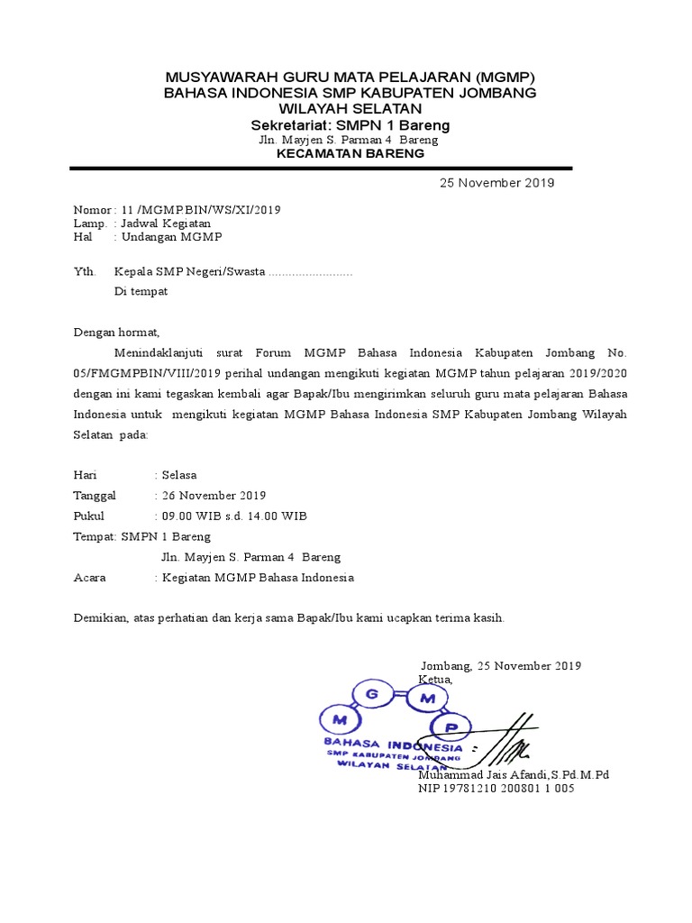 Surat Undangan Mgmp from img.dokumen.tips Untuk bagian yang sekiranya harus diganti bisa diganti menyesuaikan dengan kebutuhan ditempat anda berada. Surat undangan merupakan bagian terpenting dalam terlaksananya suatu kegiatan baik itu diselenggarakan oleh instansi pemerintah. Surat undangan dalam bahasa inggris pada umumnya digunakan oleh perusahaan, instansi pemerintah, maupun lembaga. Selamat datang, apakah anda sedang mencari informasi tentang surat undangangan? Namun penulisan dan gaya bahasa yang digunakan harus tetap sopan dan santun. Contoh surat undangan rapat warga dilingkup rt dan rw. Pesta perayaan ulang tahun merupakan kegiatan pribadi untuk merayakan hari. Surat resmi biasanya digunakan untuk tujuan yang resmi, sementara surat tidak.